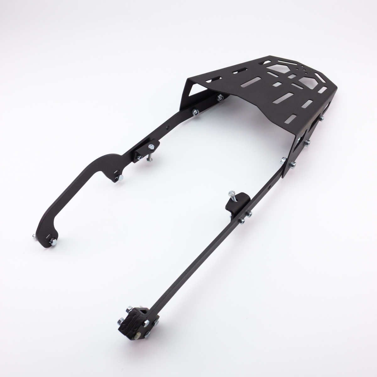 Багажник стальной на мотоциклы с рамой К8 и алюминиевым подрамником. Багажник выполнен из 4 мм легированной стали и покрашен порошковой краской. Багажник используется  для перевозки канистры с топливом, крепления кофра и др.