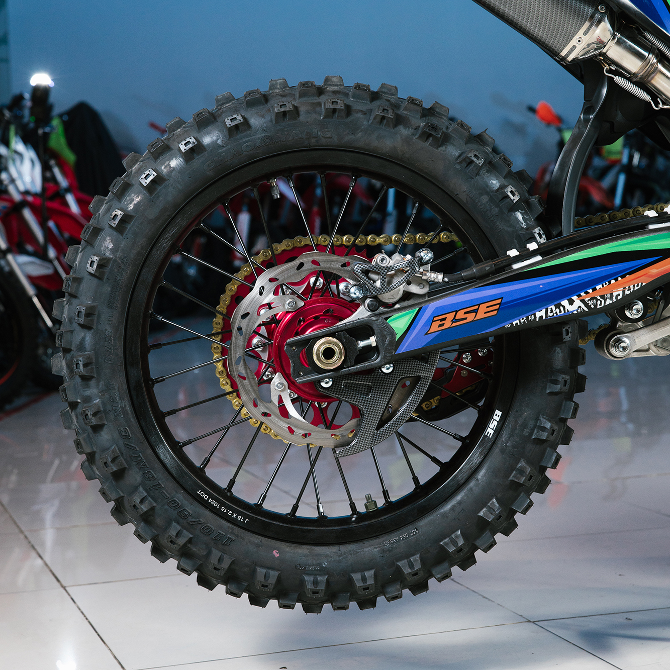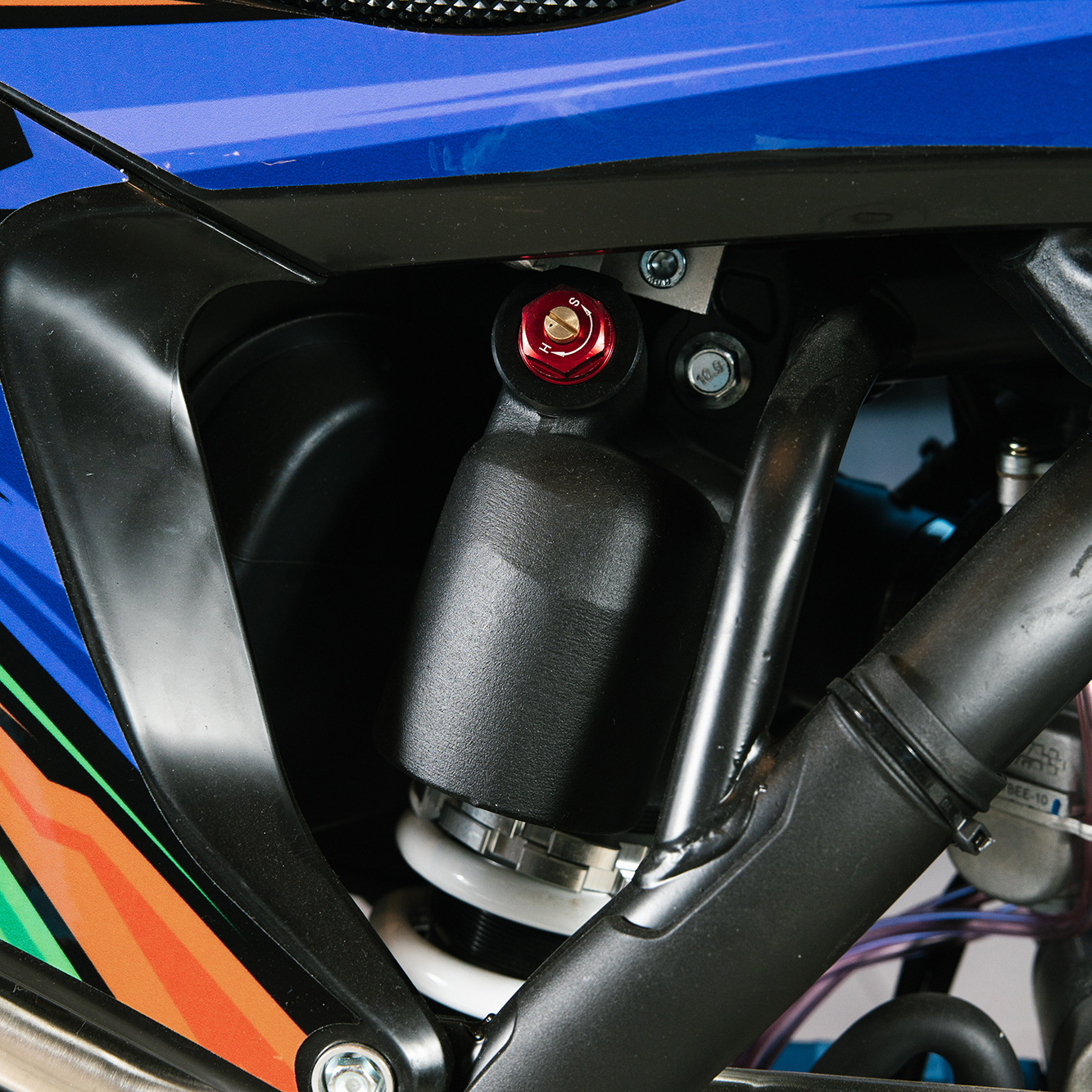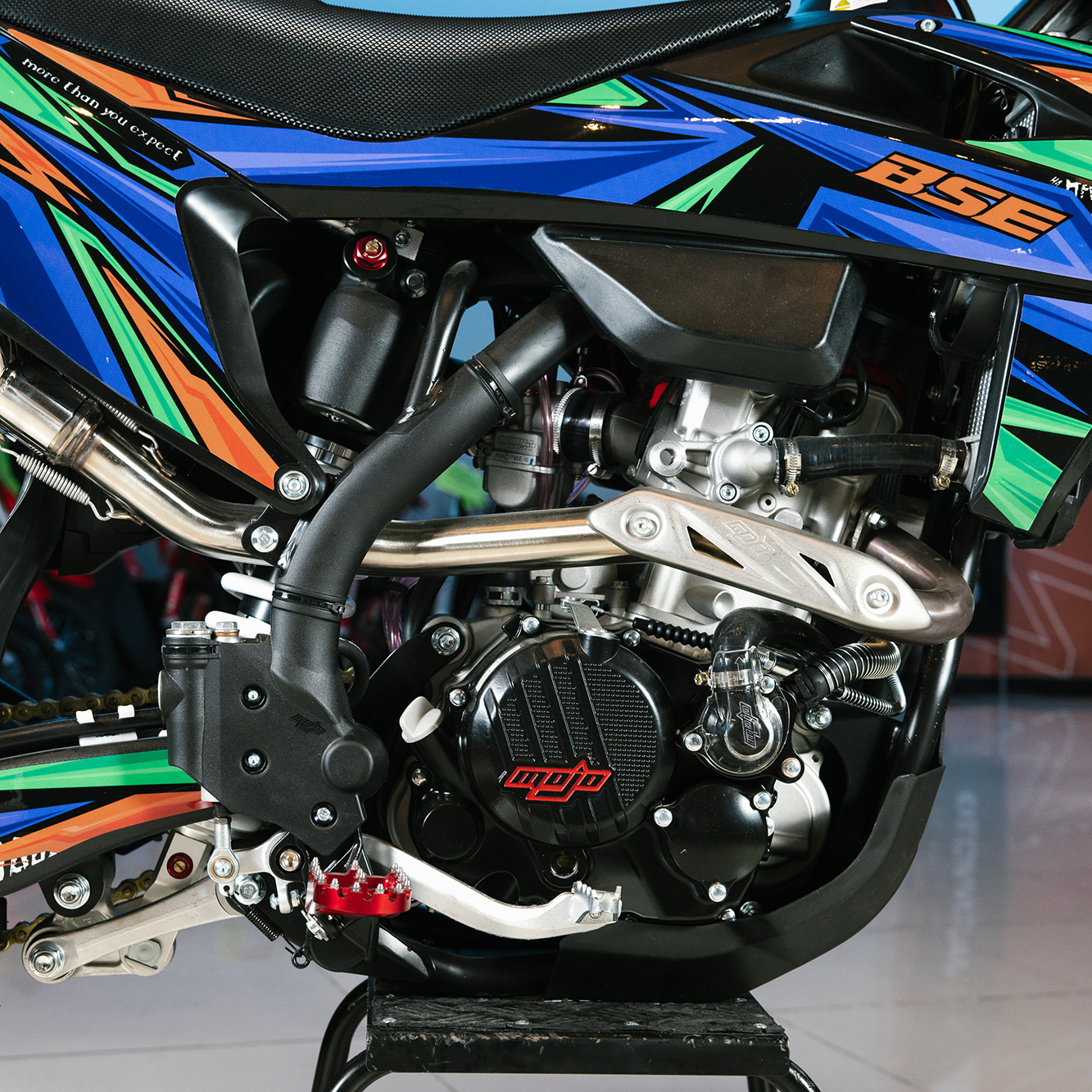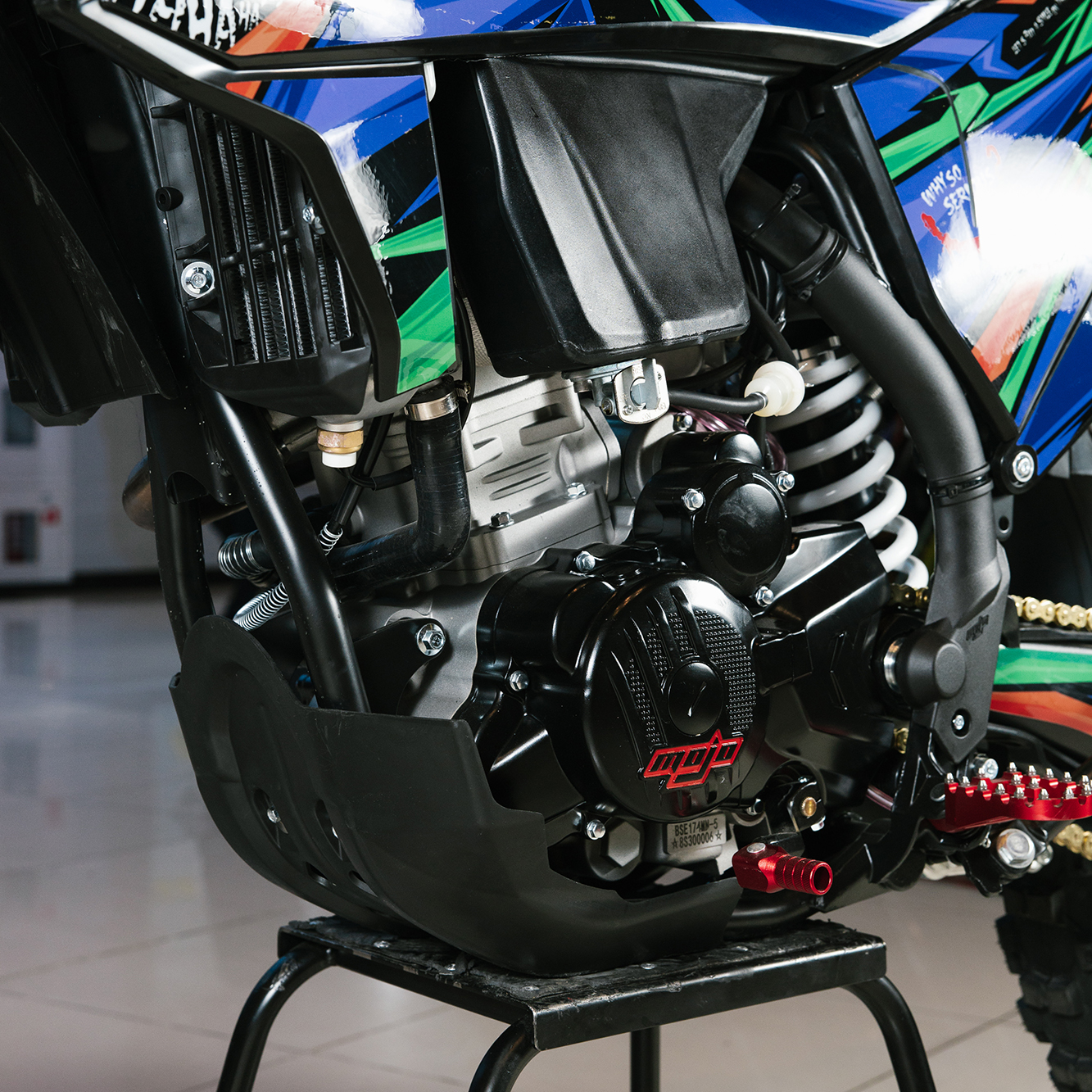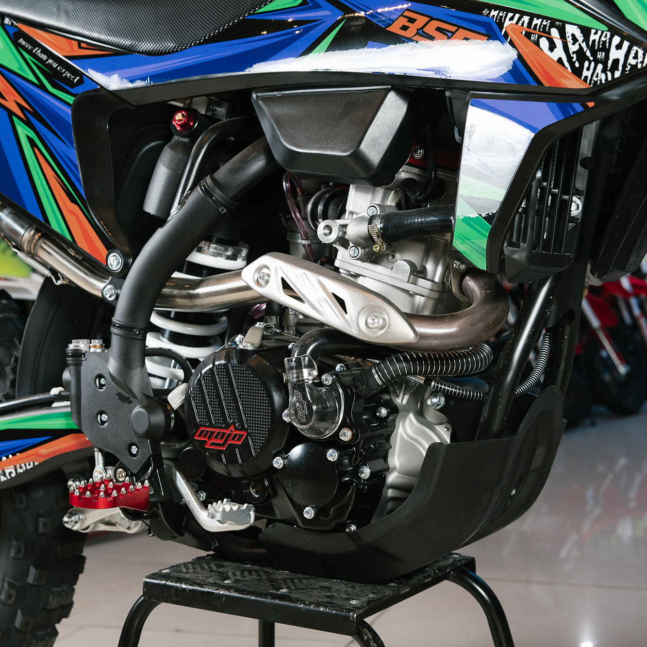 Т7 доступен в двух вариантах полностью регулируемой подвески BSE Mojo Racing: Standard c передними перьями 43 мм и более профессиональной ZL Sport c передними перьями 48 мм. Подвеска с большими ходами имеет полный диапазон регулировок и помогает отрабатывать даже самые жесткие приземления, с лёгкостью "глотая" все неровности. Подвеску легко настроить под любой рельеф, любую трассу и стиль езды. Вы ощутите результат, когда будете сокращать секунды круг за кругом! Разработка подвески BSE Mojo Racing производилась опытными инженерами-подвесочниками завода, а настройка - под чутким контролем заводской спортивной китайской командой BOSUER.  Особое внимание было направлено на снижение веса всей подвески. Сзади установлен полностью настраиваемый моноамортизатор BSE Mojo Racing 480 мм.