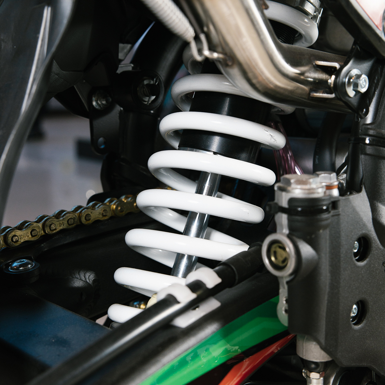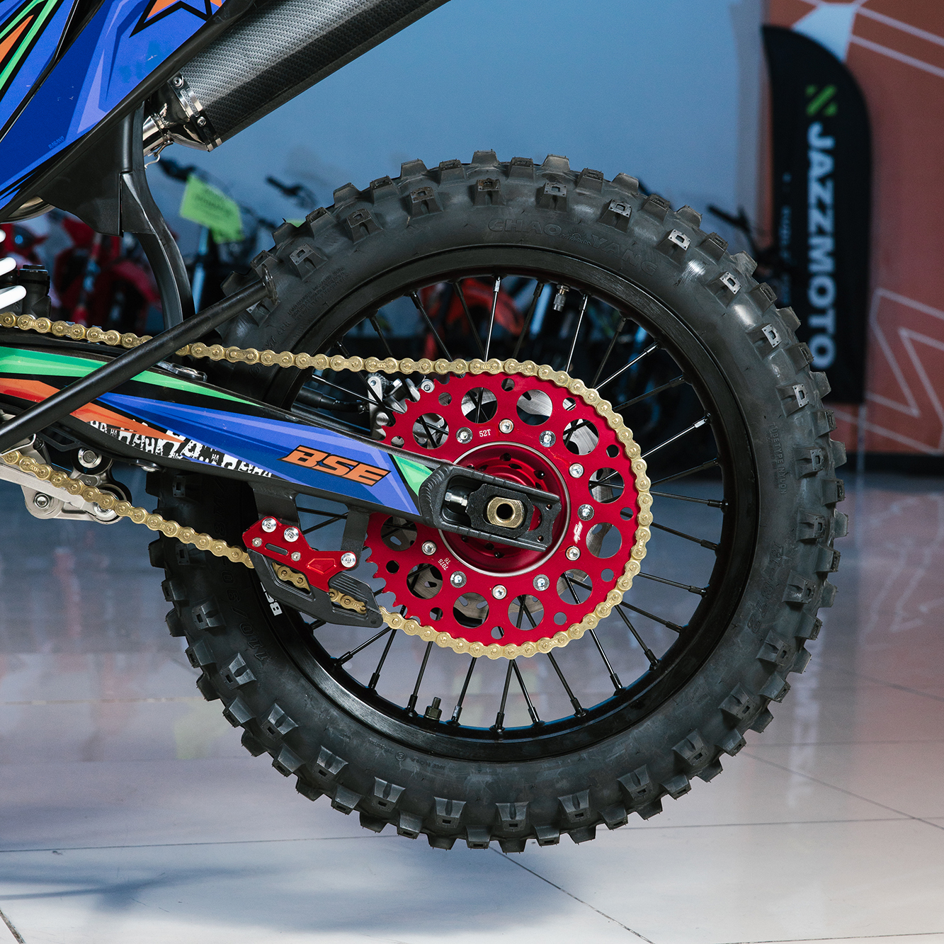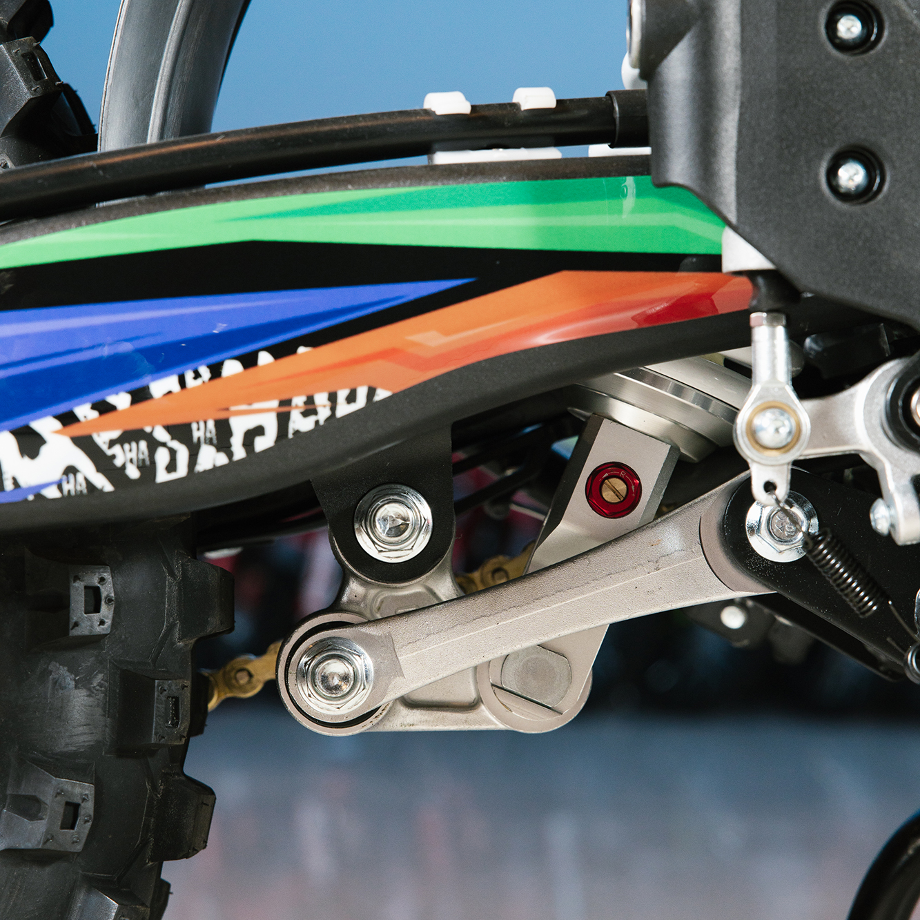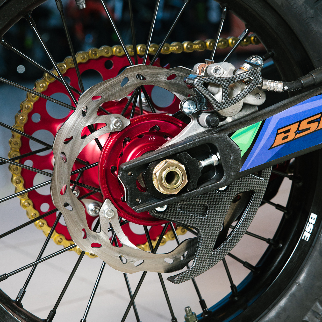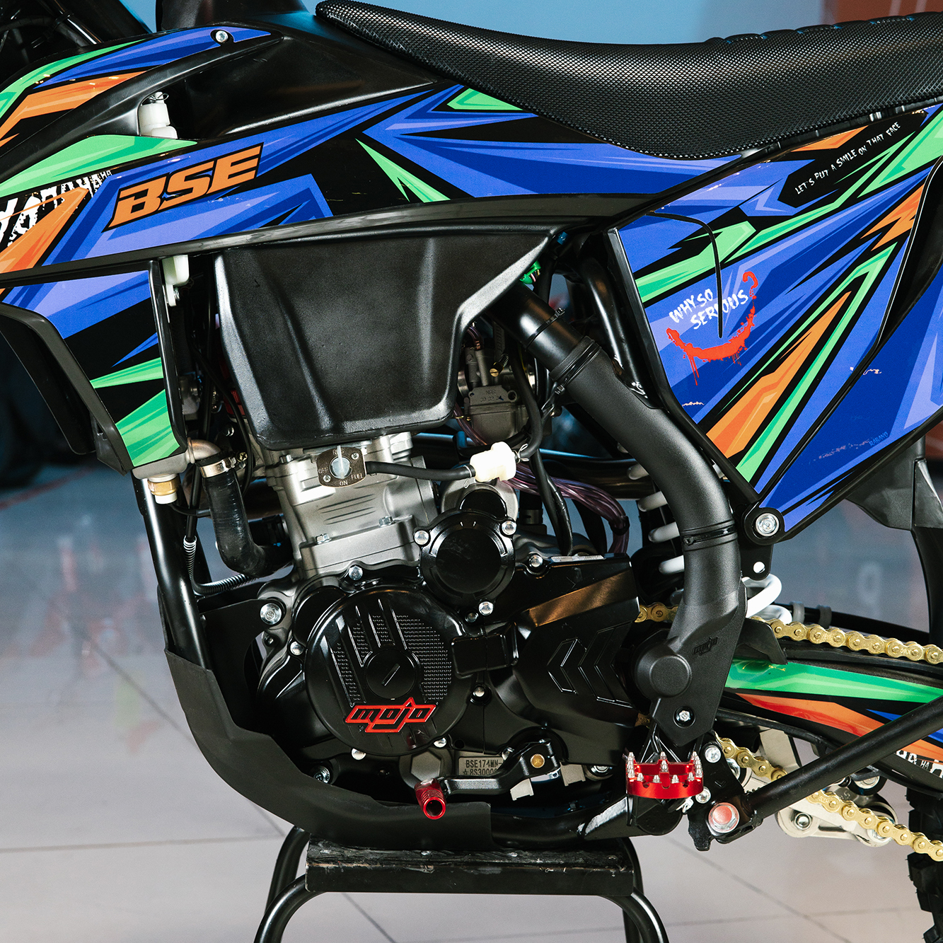 Т7 доступен в двух вариантах полностью регулируемой подвески BSE Mojo Racing: Standard c передними перьями 43 мм и более профессиональной ZL Sport c передними перьями 48 мм. Подвеска с большими ходами имеет полный диапазон регулировок и помогает отрабатывать даже самые жесткие приземления, с лёгкостью "глотая" все неровности. Подвеску легко настроить под любой рельеф, любую трассу и стиль езды. Вы ощутите результат, когда будете сокращать секунды круг за кругом! Разработка подвески BSE Mojo Racing производилась опытными инженерами-подвесочниками завода, а настройка - под чутким контролем заводской спортивной китайской командой BOSUER.  Особое внимание было направлено на снижение веса всей подвески. Сзади установлен полностью настраиваемый моноамортизатор BSE Mojo Racing 480 мм.