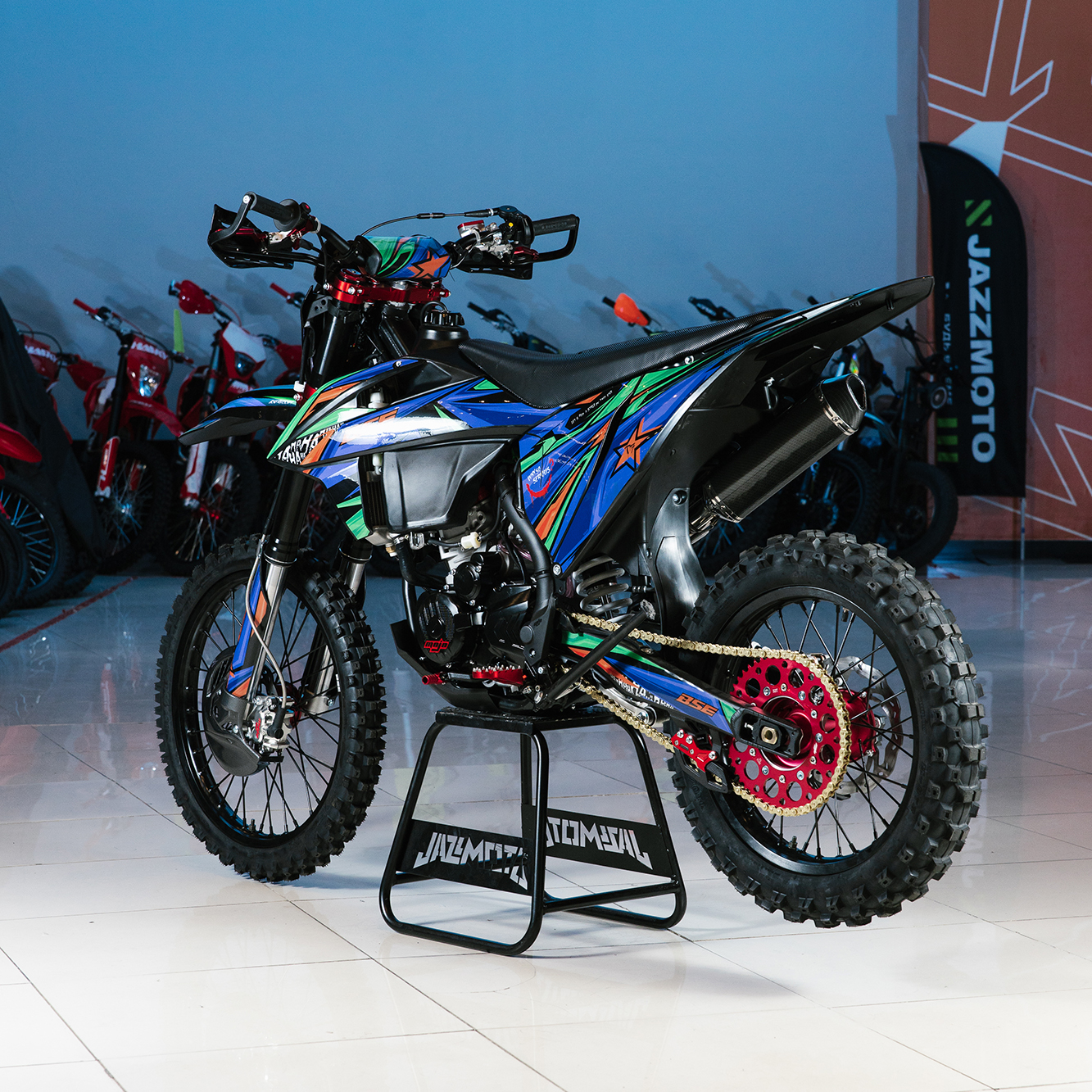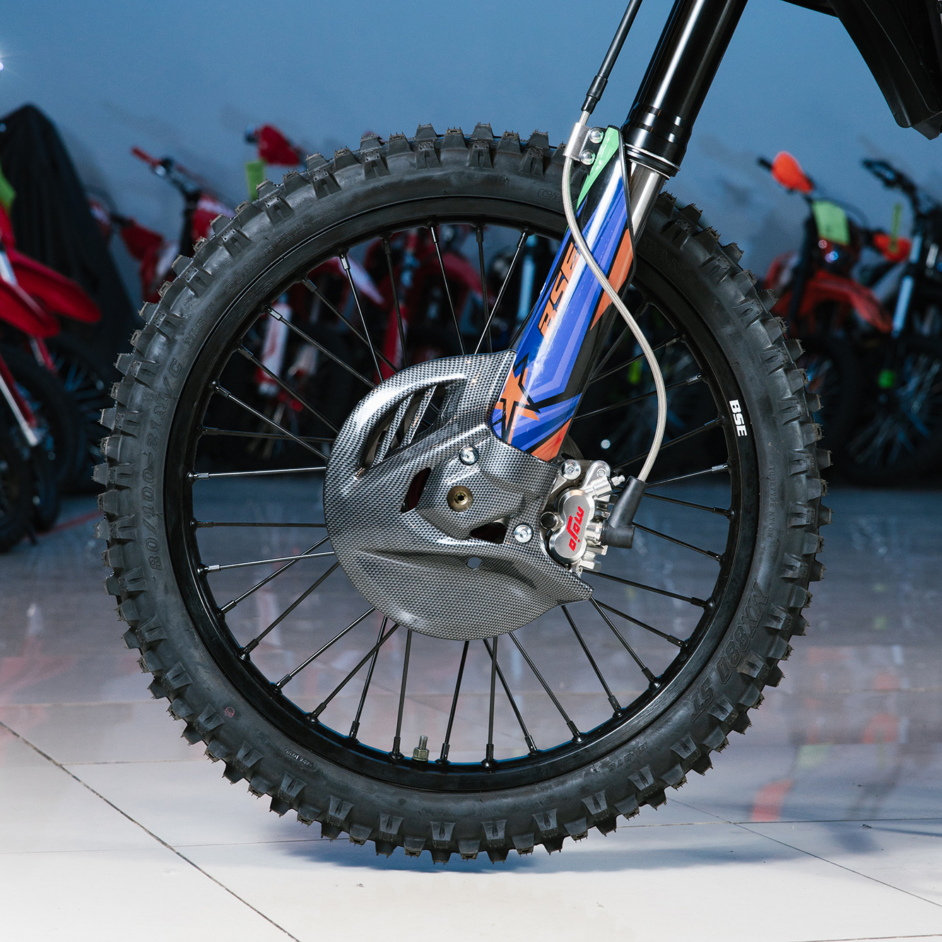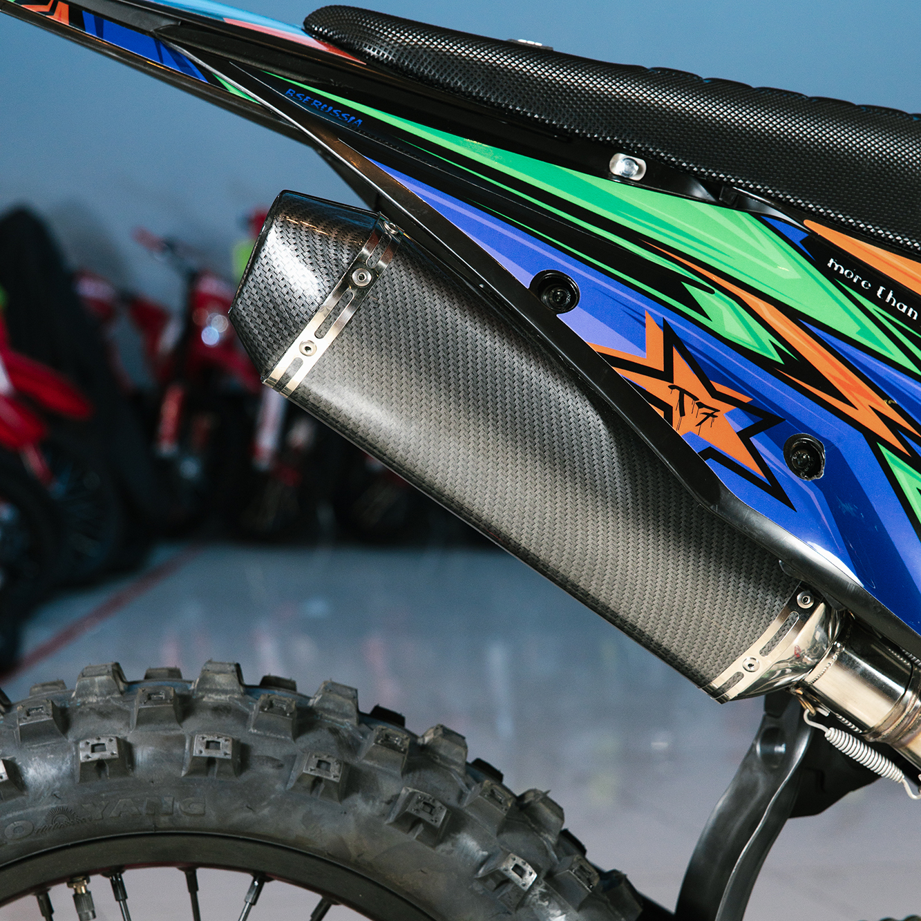 На T7 установлен топливный бак на 8 л, мощная тормозная гидравлическая система с дисками диаметром 240 мм, звезды 13t – 49t, «зубастые» покрышки CHAOYANG MX880 ST. Мотоцикл оснащается полностью светодиодной фарой головного света, грипсами и ручкой газа Nibbi Racing, металлической защита рук, CNC подножками с увеличенным зацепом, цепкой шкуркой сиденья и защитой тормозных дисков под карбон.