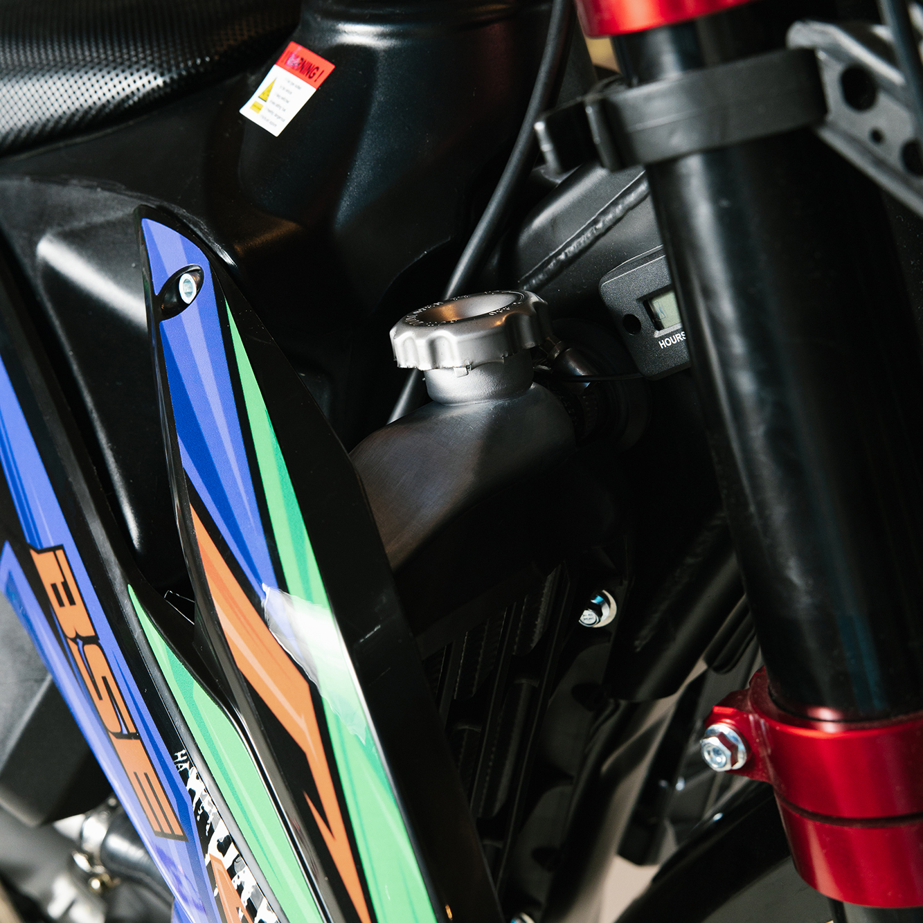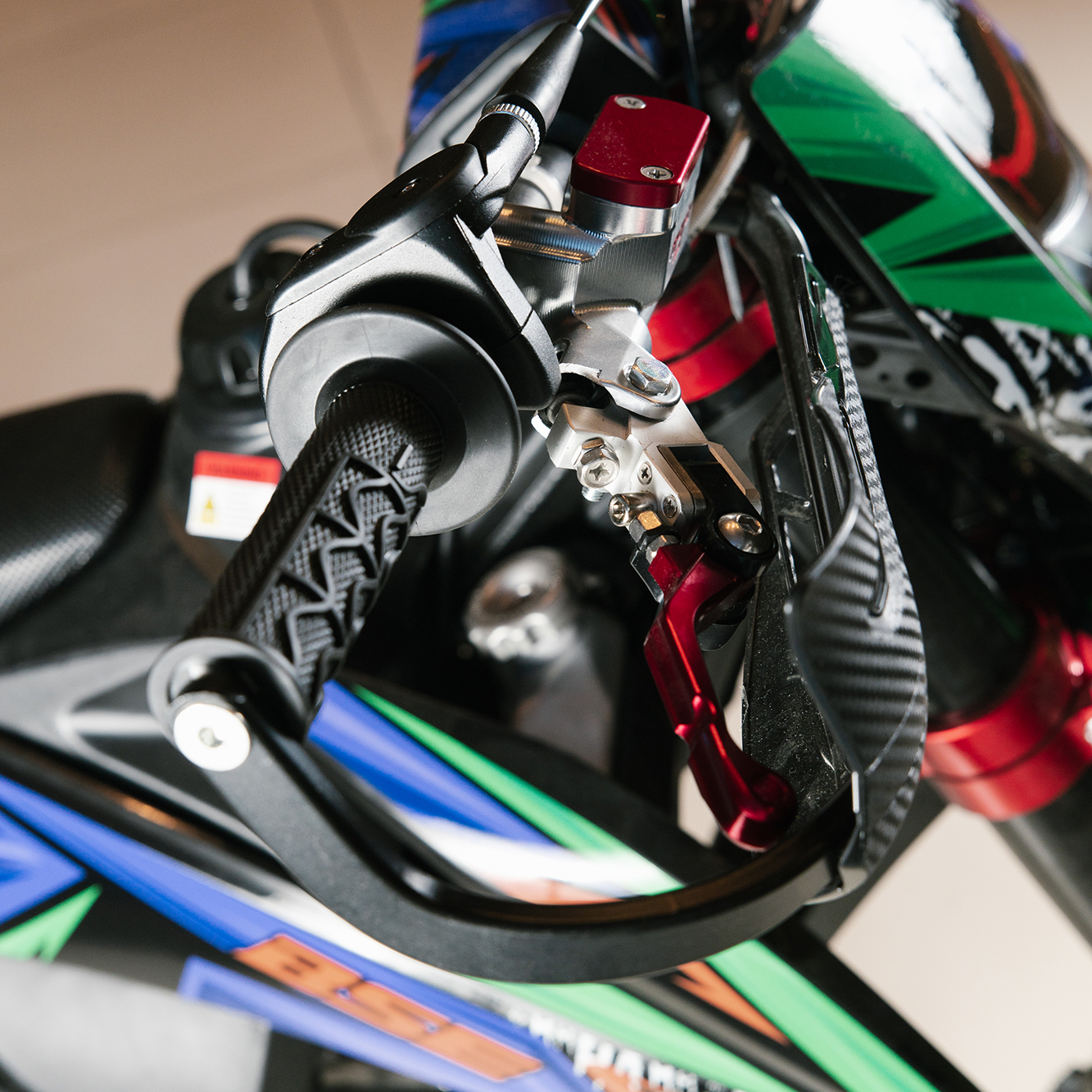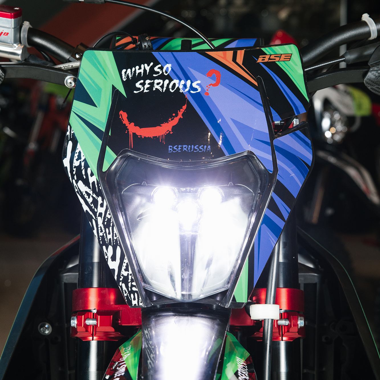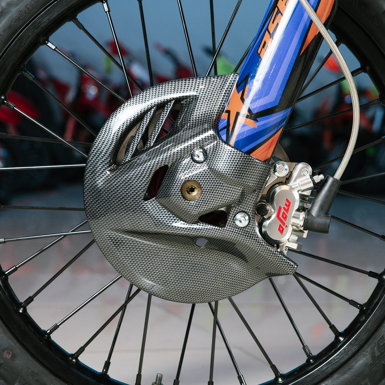 На T7 установлен топливный бак на 8 л, мощная тормозная гидравлическая система с дисками диаметром 240 мм, звезды 13t – 49t, «зубастые» покрышки CHAOYANG MX880 ST. Мотоцикл оснащается полностью светодиодной фарой головного света, грипсами и ручкой газа Nibbi Racing, металлической защита рук, CNC подножками с увеличенным зацепом, цепкой шкуркой сиденья и защитой тормозных дисков под карбон.