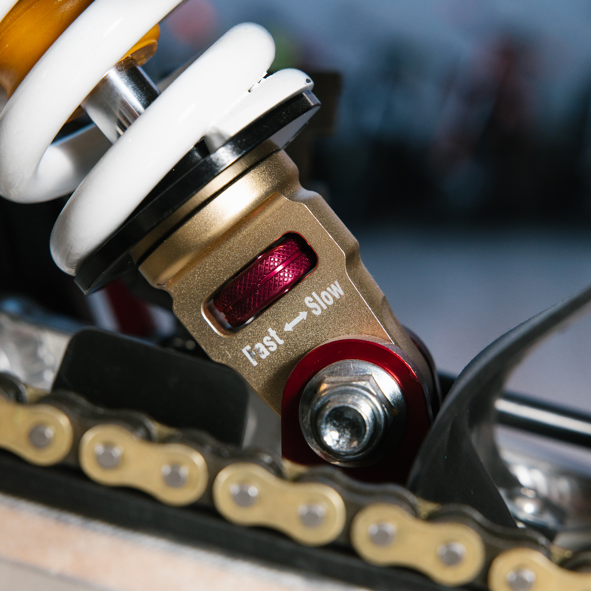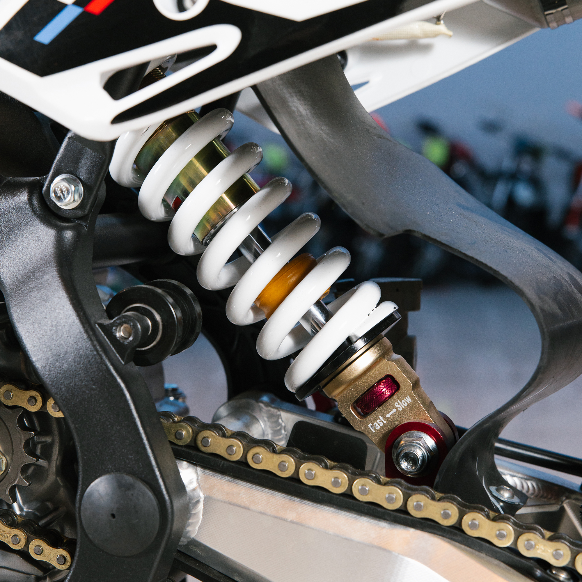 Подвеска питбайка обеспечивает высокий уровень комфорта и надежности: передняя телескопическая перевернутая вилка Fastace длиной 800 мм имеет регулировки отбоя и сжатия, а задний моноамортизатор DNM DHL 360 — регулировки отбоя, сжатия и скорости отбоя. Алюминиевый маятник с усиленной 15-миллиметровой осью рассчитан на значительные нагрузки, а колеса с прочными алюминиевыми ободами из сплава 7116, усиленными спицами и качественной резиной с агрессивными грунтозацепами обеспечивают надежность и уверенное прохождение сложных участков.
