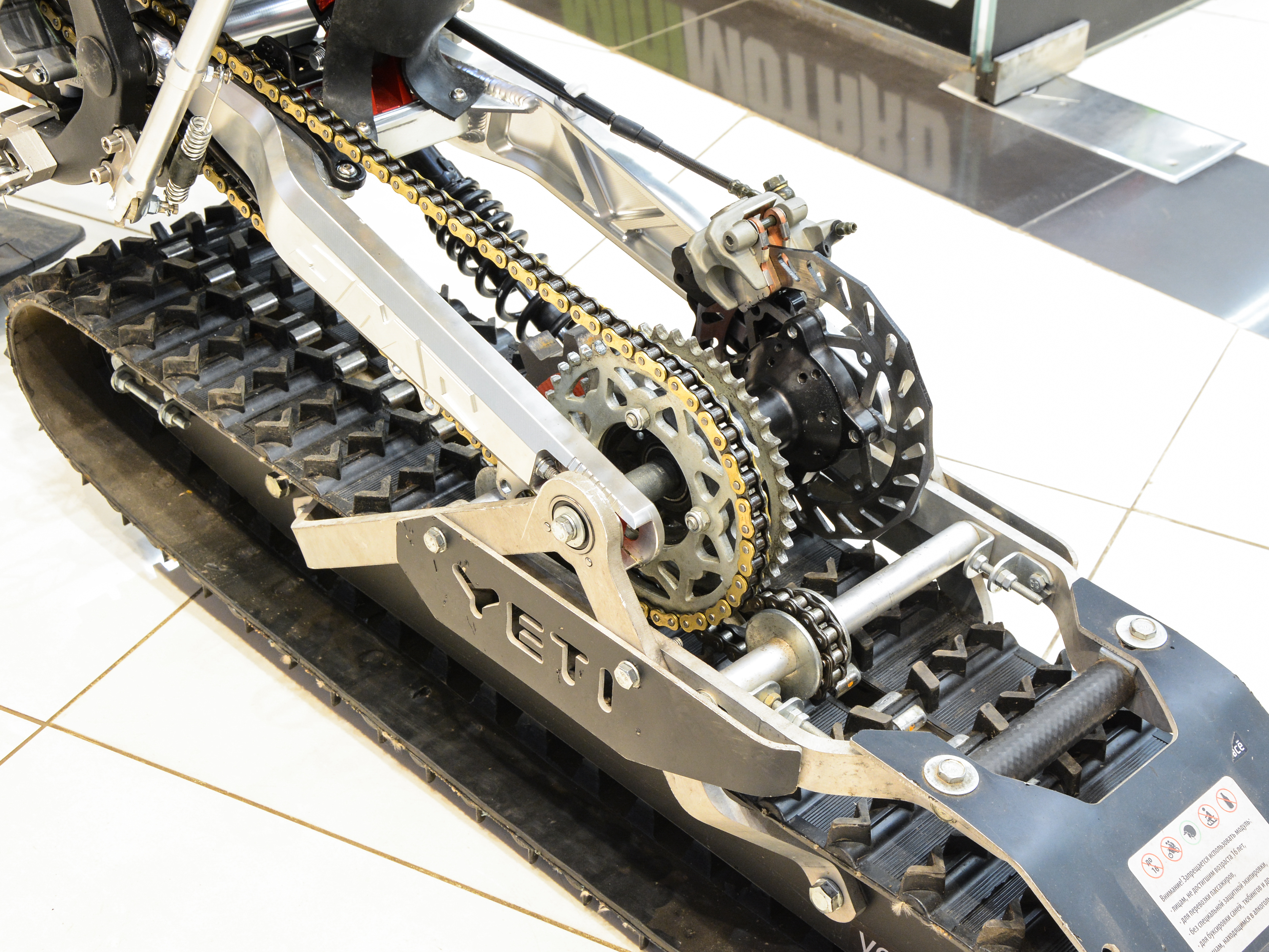 - Установлена гусеница фирмы YETI (за счет ее конструкции получается сохранить компактные габариты тк большая ее часть уходит под сам питбайк. Длина пита изменилась не сильно, а к весу добавилось порядка 20 кг.)